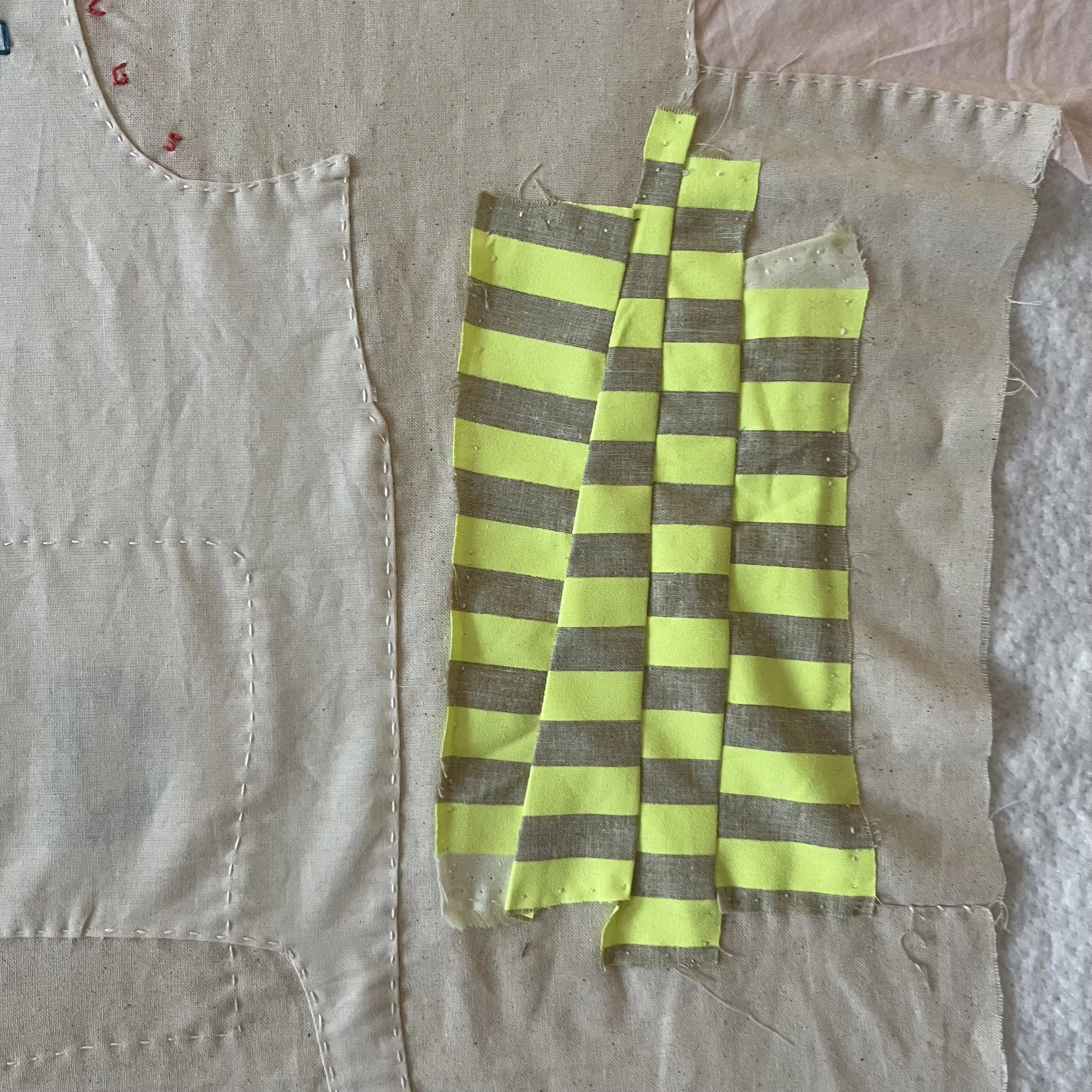 Then came this nod to Toni’s lovely way of using staggered piecing in this neon fabric she gave me.