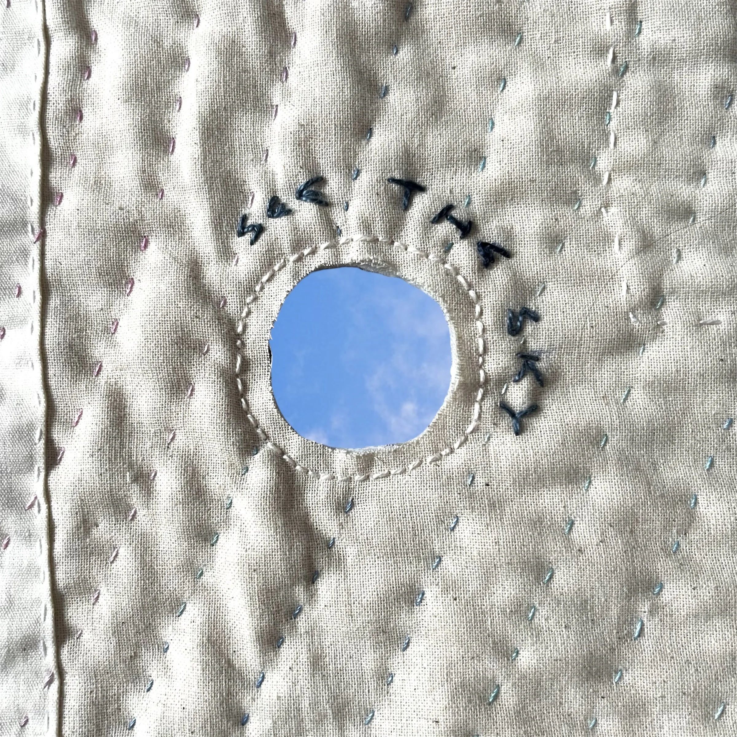 I learned a lot about conceptual art last year from Megan, and wanted to represent her and Yoko Ono’s “A Hole To See The Sky Through” with this hole cut right through the quilt.