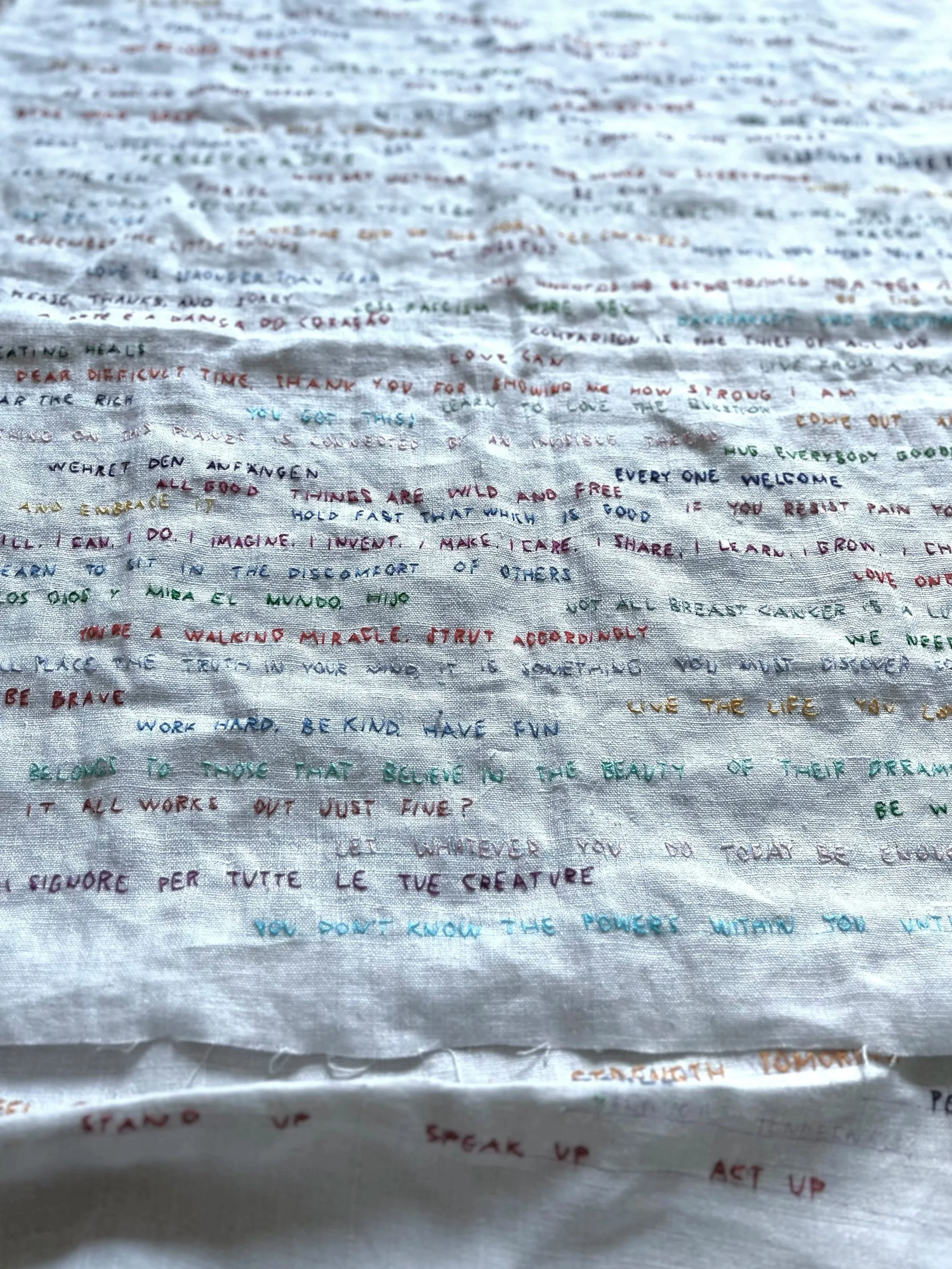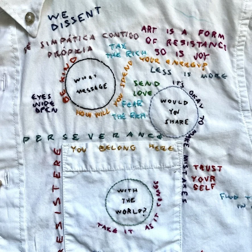 In early 2025, I posted a question on Instagram, asking people what message they would like to share with the world. Grateful for the lovely messages that were shared, I began stitching them onto a repurposed white shirt, but quickly found the weave too dense to stitch through comfortably, and also felt it looked too chaotic.